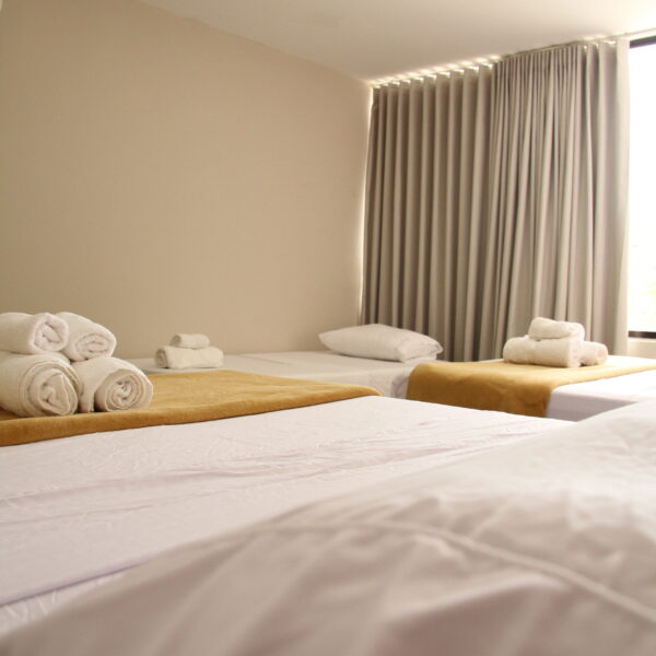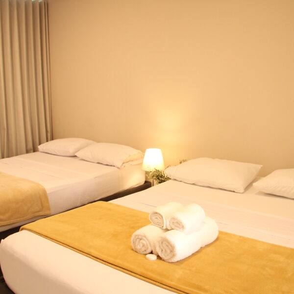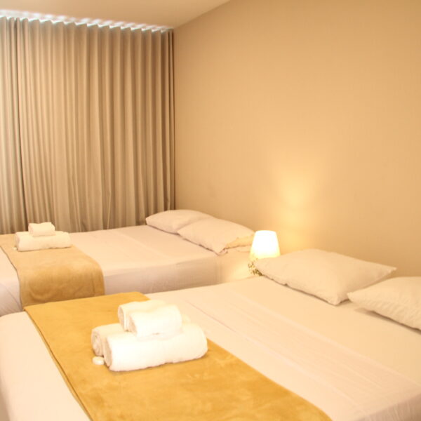 Esta habitación, para máximo 11 personas, cuenta con cuatro camas dobles de 1,40 cms. (cada una), y una cama sencilla (1 m.). La habitación cuenta con tv satelital, minibar y baño privado con artículos de aseo personal.